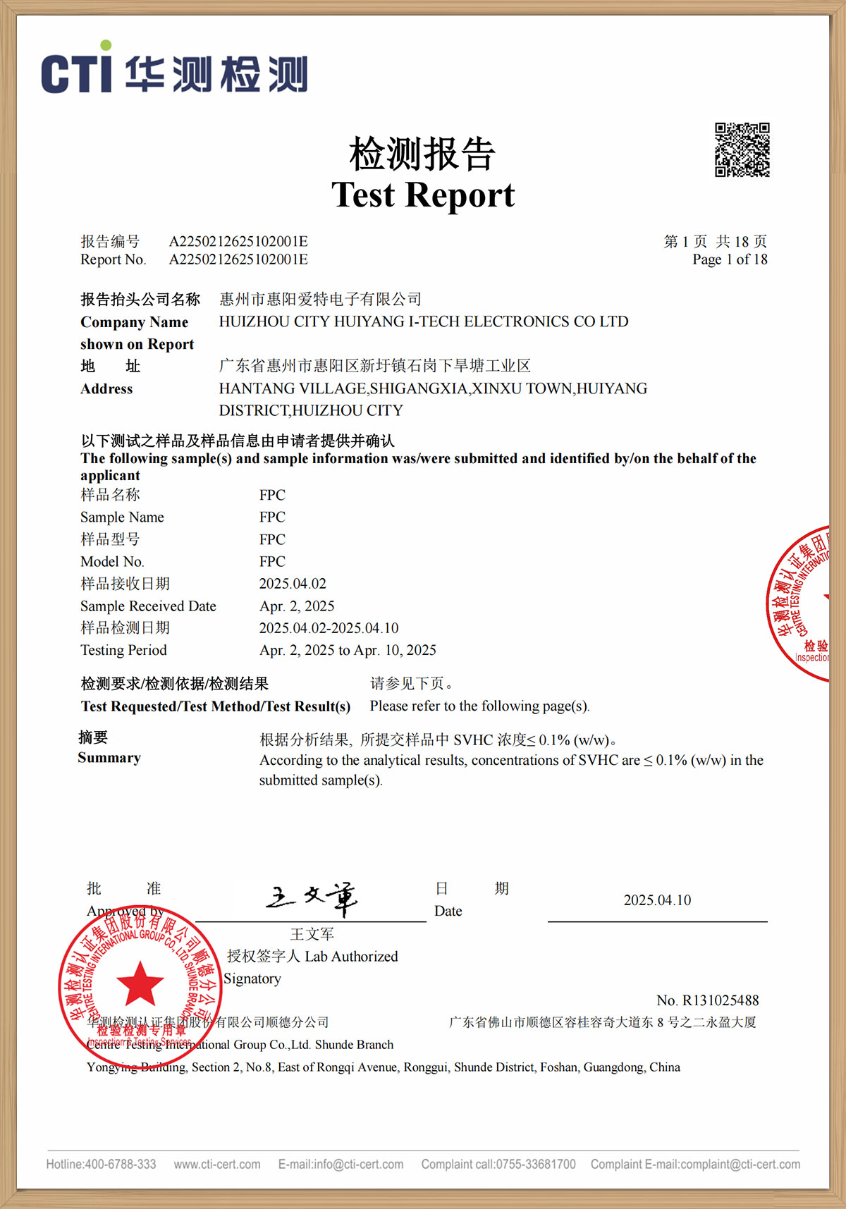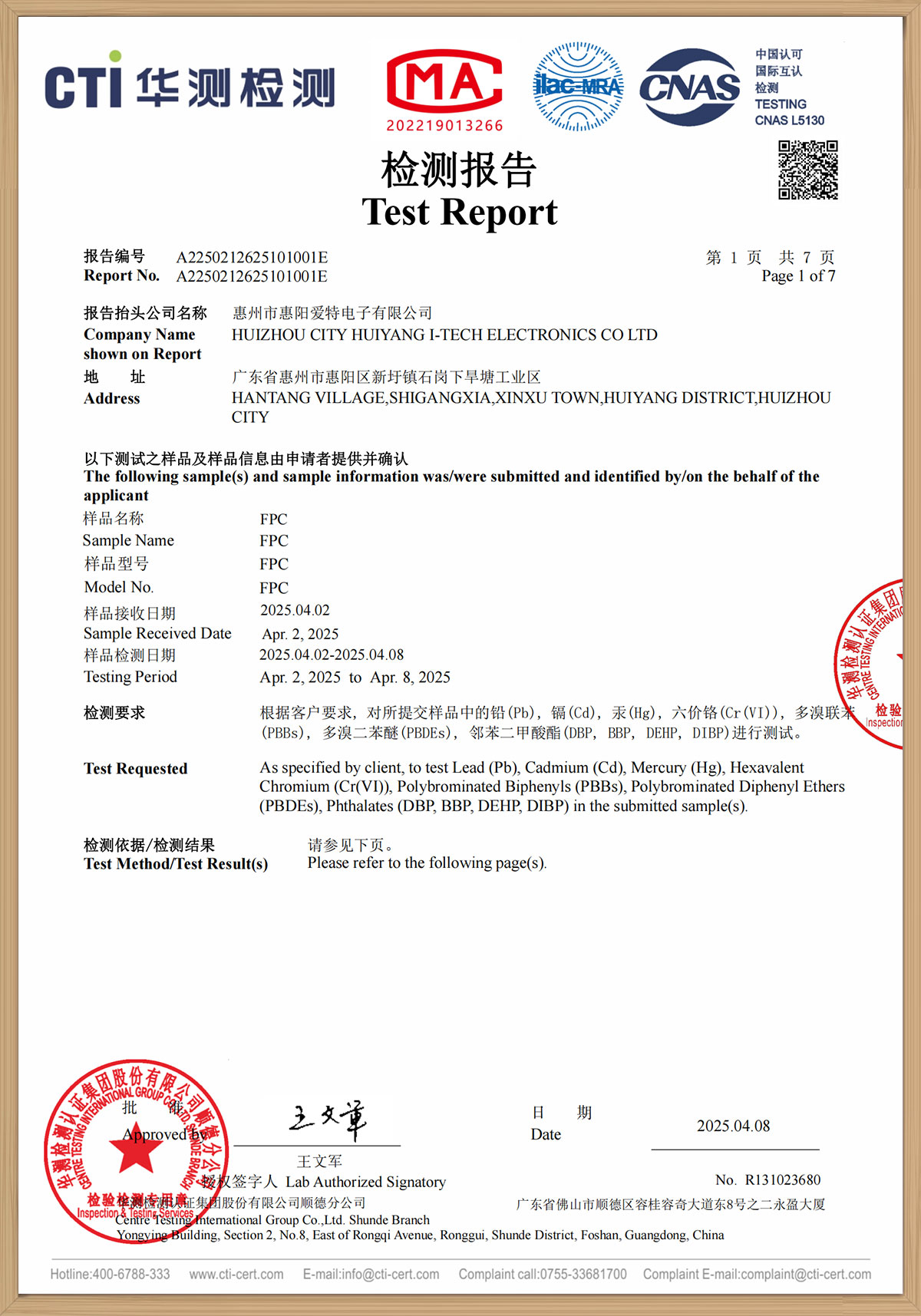 華測檢測報(bào)告